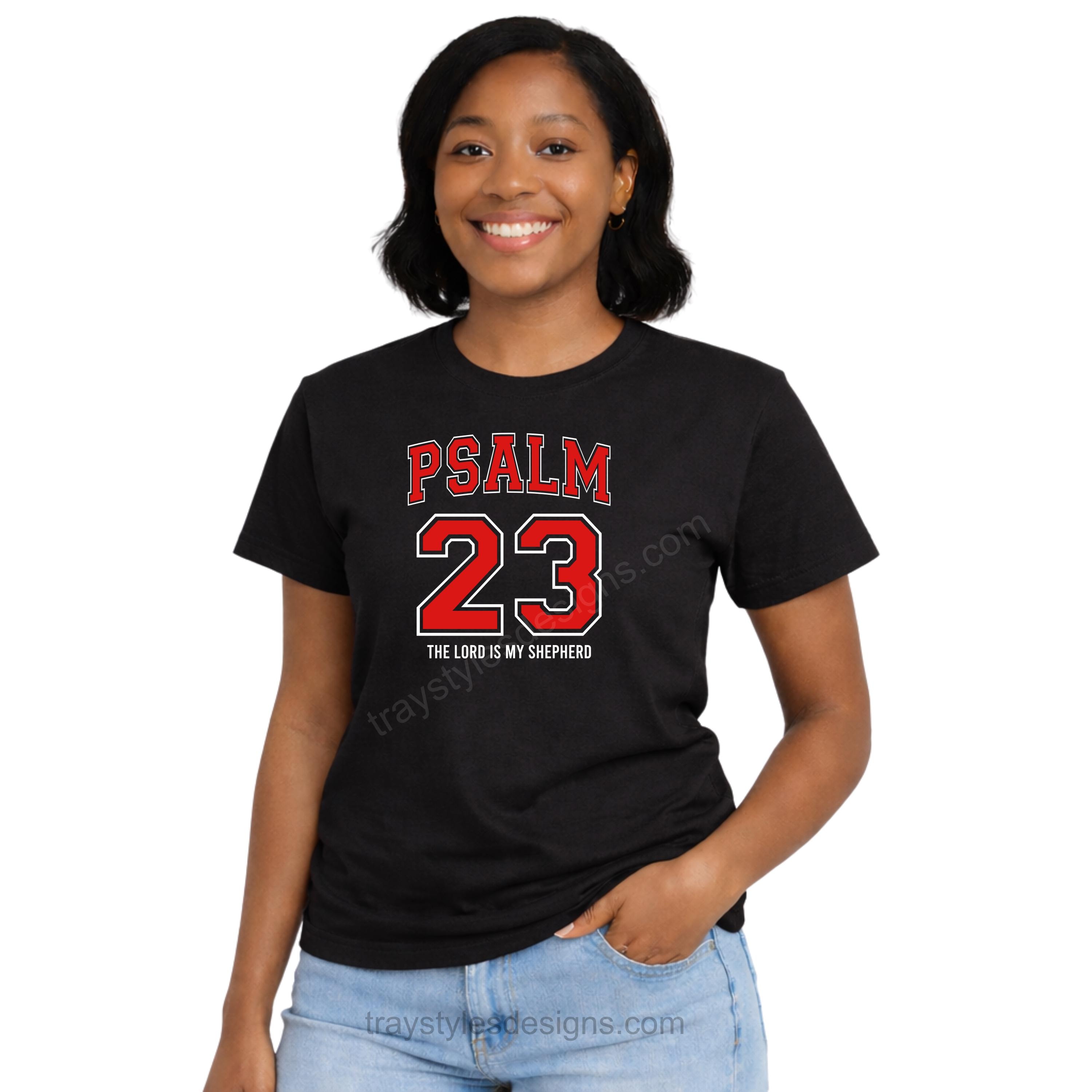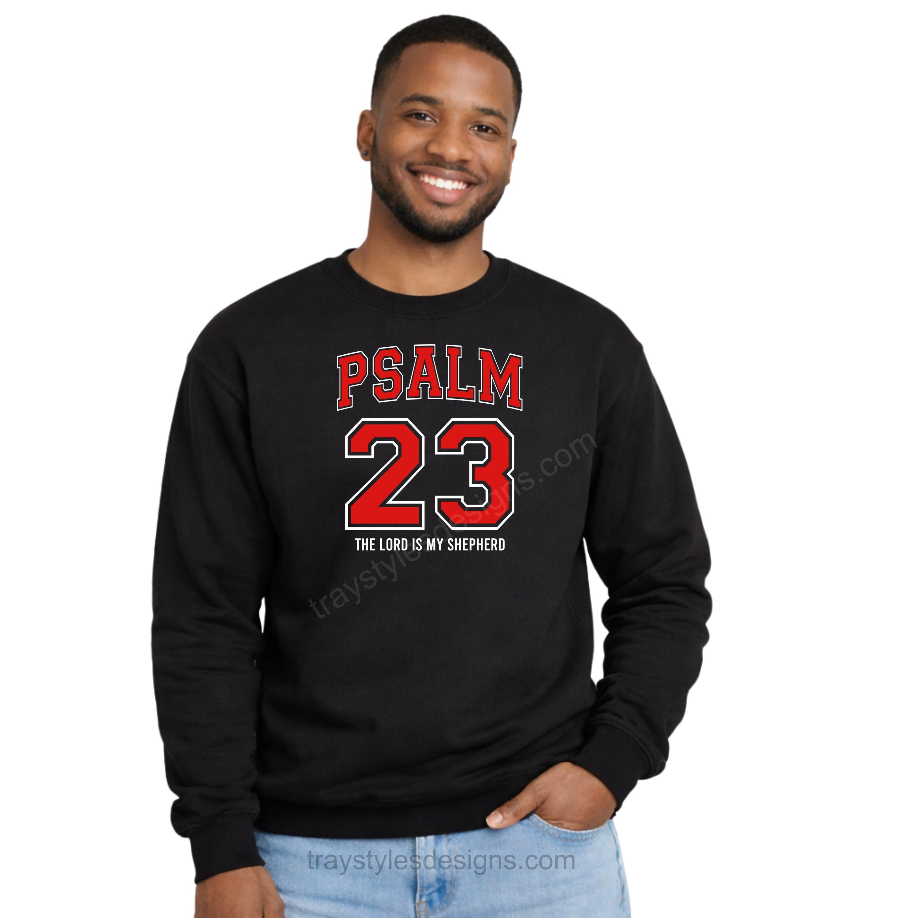 Wear your faith boldly with our Psalm 23 “The Lord Is My Shepherd” design. This clean, athletic-inspired layout features bold varsity lettering with a powerful reminder of God’s guidance and protection.