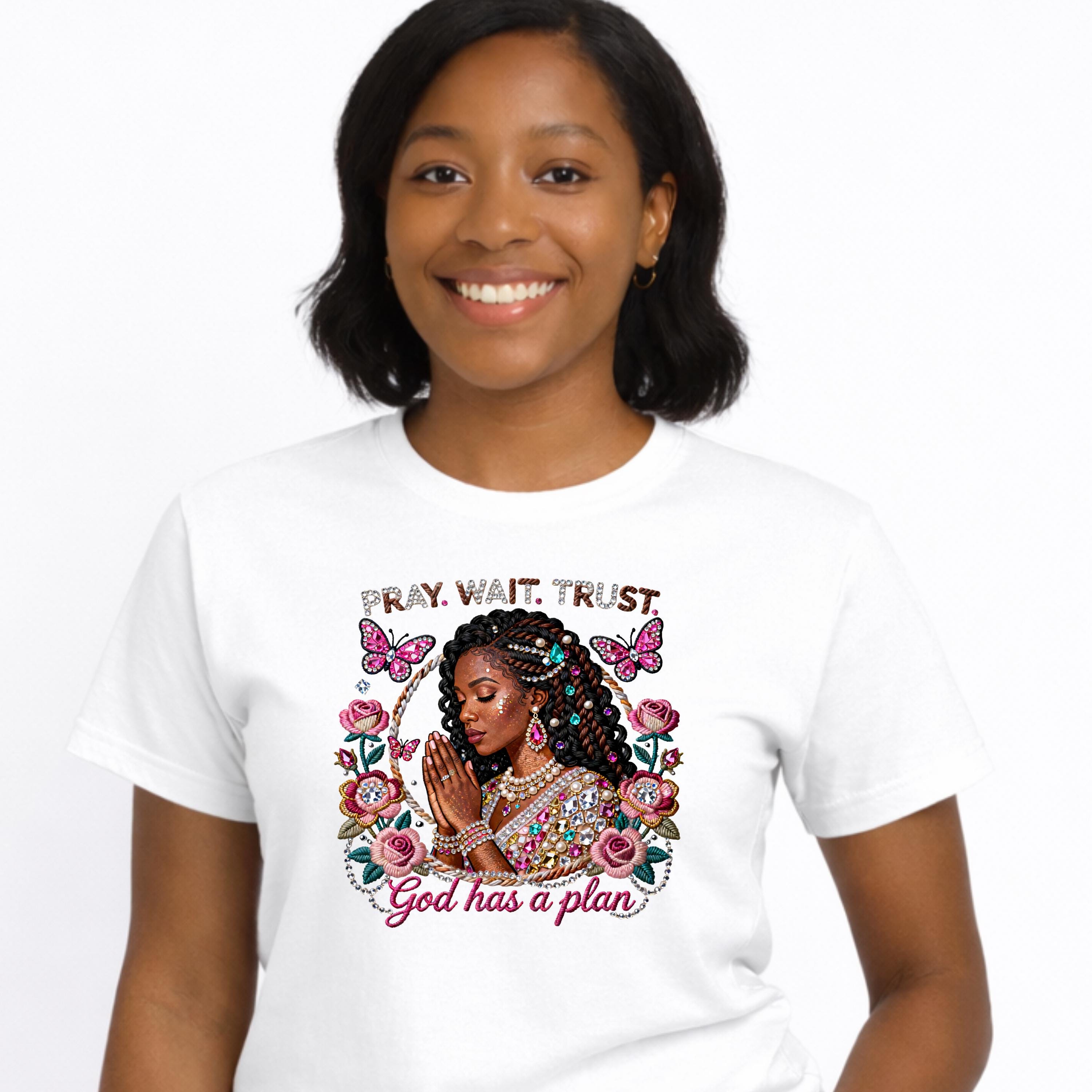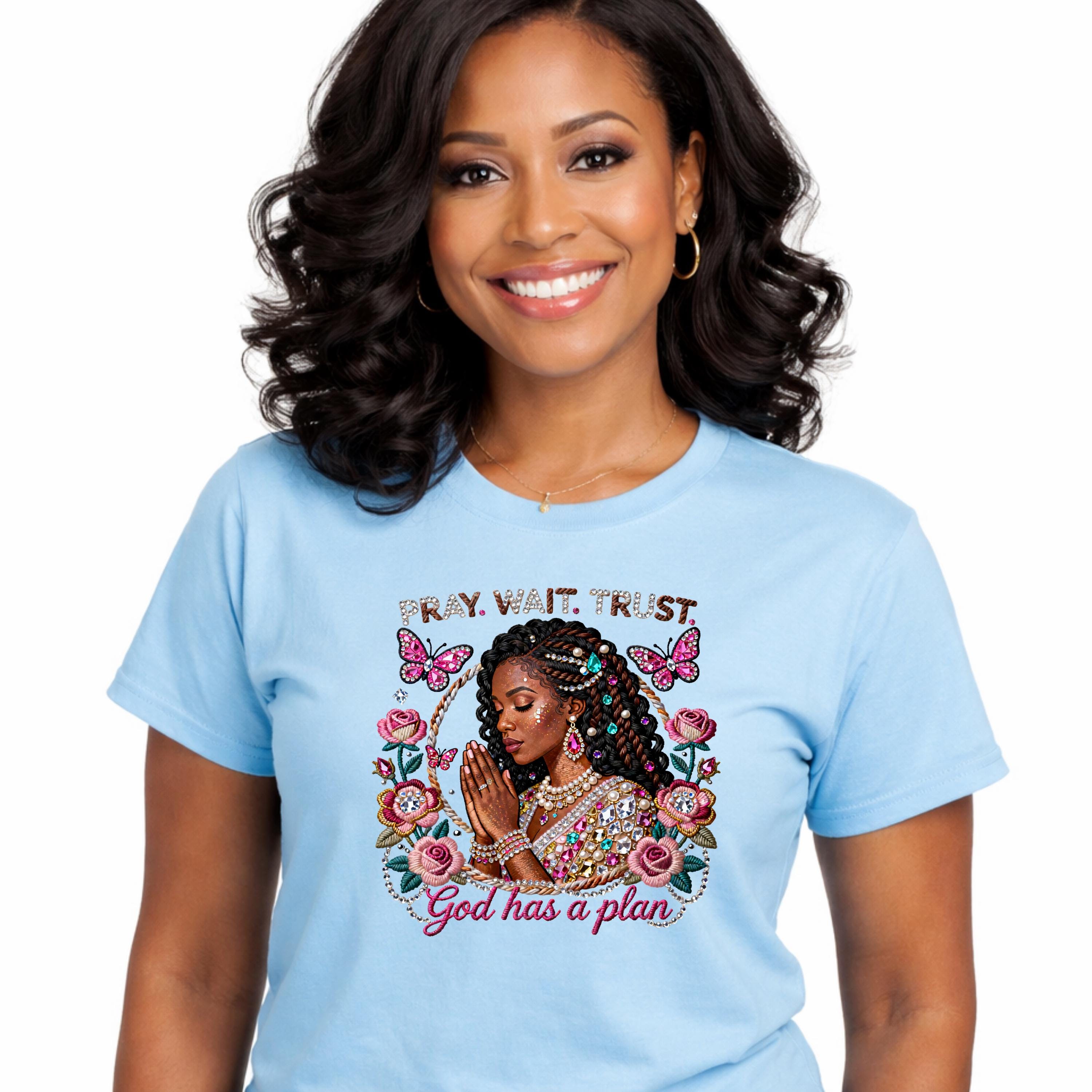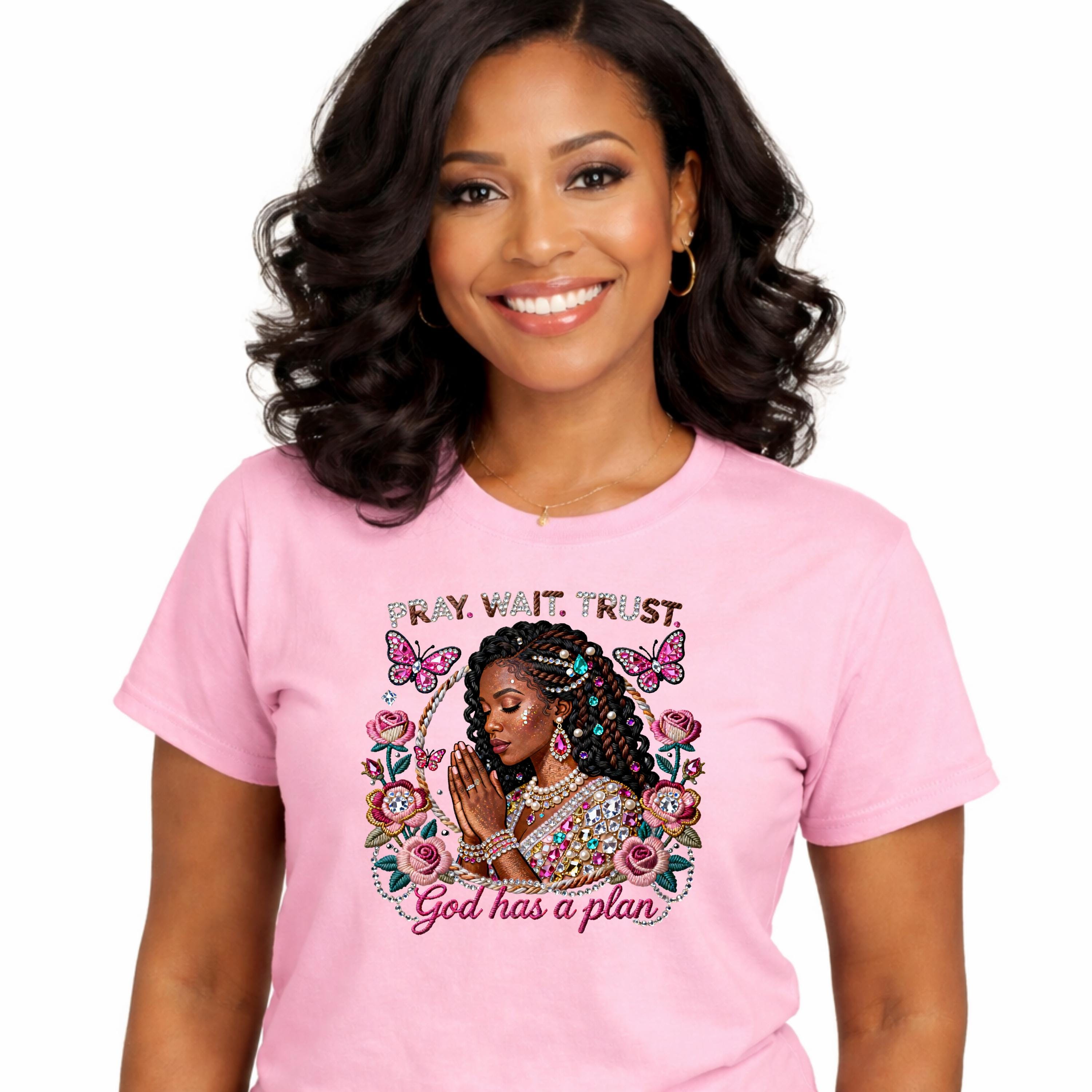 Stay grounded in faith and confidence with our “Pray Wait Trust” Women’s Tee. Designed for everyday comfort and spiritual encouragement, this shirt is a reminder to trust God’s timing and stay patient through every season.